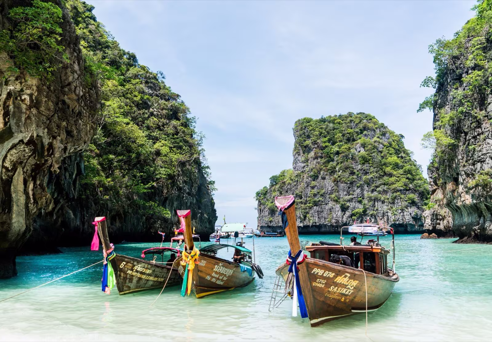 Longtail boats in turquoise lagoon surrounded by limestone cliffs, Phuket Thailand